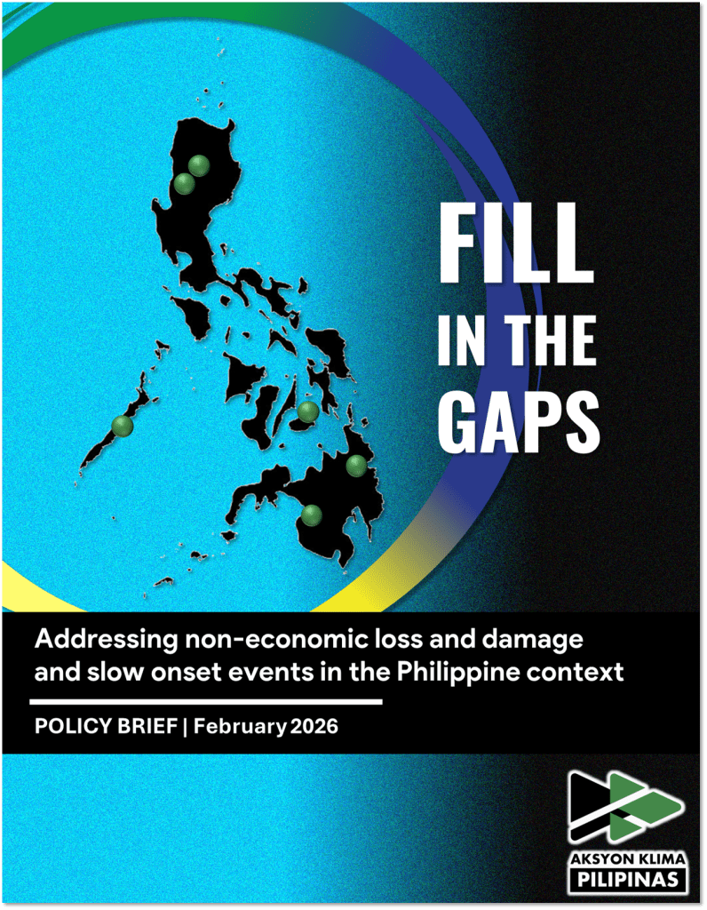 This policy paper is the intended second submission of Aksyon Klima Pilipinas to the ongoing work under the L&D Priority Support Framework and other related engagements by the Philippine government. It presents three case studies on how slow onset events and non-economic L&D affects climate-vulnerable communities, which serve as the basis for its recommendations to focus on “filling in the gaps” – to prioritize L&D-related issues that currently lack dedicated mechanisms or financing resources in the Philippine context. This submission is aligned with a “bottom-up” approach necessary to this workstream.